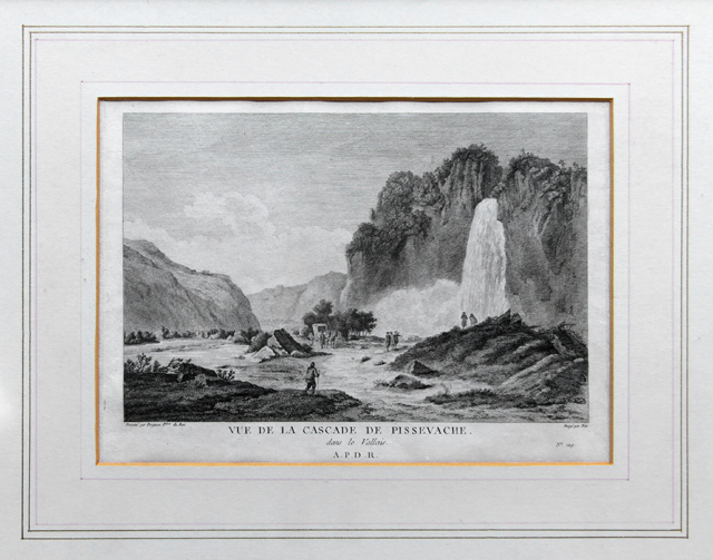 Titre: Vue de la cascade de Pissevache dans le Vallais [i.e.Valais] A.P.D.R. [i.e. Avec