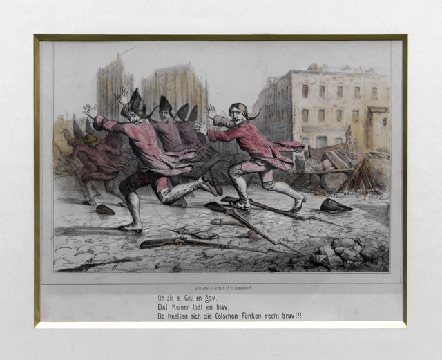 Titre: On als et Gott en gav,/ Dat Keiner todt en blav,/ Do heelten sich die Cölschen Fonken